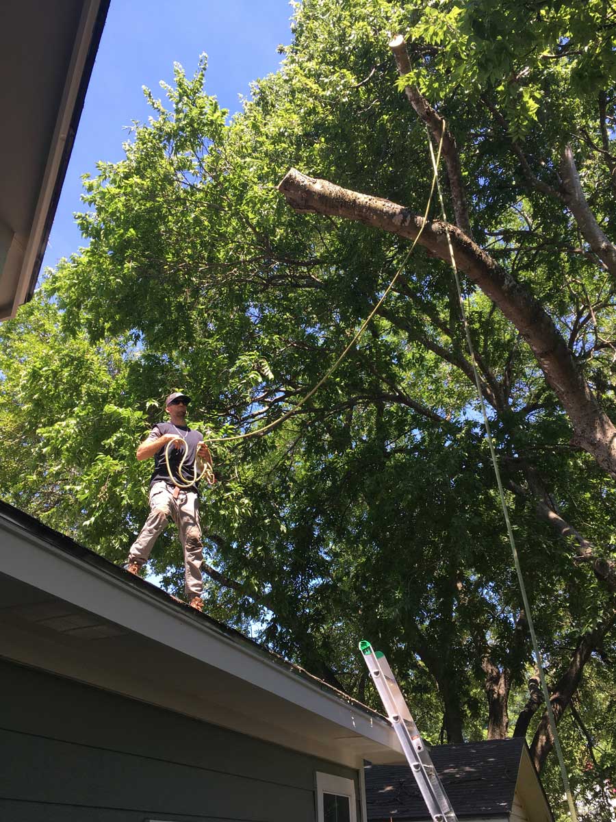 Gavin using the ropes to remove split Hackberry tree from over the roof.