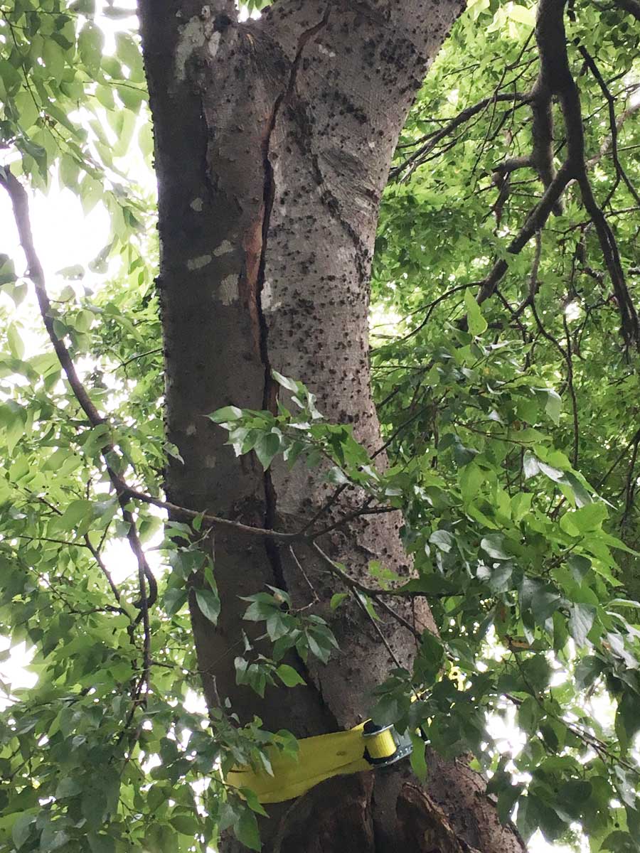 Hallowed out Hackberry tree that split after heavy rains and was hanging over the house.